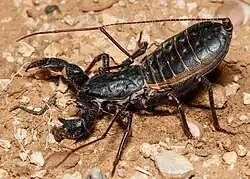 Mastigoproctus giganteus lives in the southern US and in Mexico at elevations up to 6000 meters.[4] It preys on various insects, worms, and slugs.[5] It is an efficient predator that feeds at night on a variety of arthropods, primarily insects such as cockroaches and crickets, as well as millipedes and other arachnids. It has even been recorded feeding on small frogs and toads. It uses its large pedipalps to hold prey, while the chelicerae tear and bite the prey.[6]