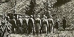Zelle was executed by a firing squad consisting of 12 French soldiers just before dawn on 15 October 1917. She was 41.[43] According to an eyewitness account by British reporter Henry Wales, she was not bound and refused a blindfold. She defiantly blew a kiss to the firing squad.[32]