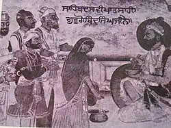 ![]() Detail of Mata Jito appending sugar crystals to Amrit during Vaisakhi 1699 from a fresco that was located in the original Akal Takht building | |