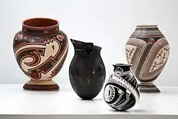 Paquimé pottery is closely related to the larger family of Pueblo pottery, showing influence from Arizona, New Mexico and central Mexico along with elements which are distinctive to the area.[3][7] Various colors appear in the works including a nearly white ivory, a reddish color and black.[6] Paquimé pottery was traded throughout North America.[2]