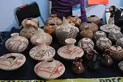 One critical element to the development of ceramics in Mata Ortiz is its proximity to the Paquimé or Casa Grandes archeological site.[5] Paquimé is one of the most important archeological sites in northwest Mexico/southwest U.S. region and center of the Mogollon culture .[6] This culture reached its peak around 1400, with evidence of its influence hundreds of kilometers from its center in present-day Chihuahua state.[7] Excavations of Paquimé were undertaken between 1958 and 1961 by archeologist Charles C. Di Peso, which sparked local interest in the site.[8] However, by the time the pottery revival began in Mata Ortiz, Paquimé had not been studied as well as other desert cultures in the region and there was little expert knowledge about its pottery.[3] Since then, the Museo de las Culturas del Norte was opened at Paquimé in 1997 and it was declared a UNESCO World Heritage Site in 1998.[8]
