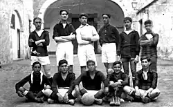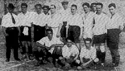 In late 1912, however, a conflict between members and internal differences caused some of them to leave the club to create a new one, Iluro Sport Club.[2] In February 1913, the second team of Mataró faced the second team of the newly founded Iluro SC in a match held at Fomento and refereed by Cuadrada, but the result is unknown.[3][6] Mataró soon developed a rivalry with Iluro, but they avoided playing each other, facing good opponents from Barcelona instead, with Mataró even beating Catalunya de Barcelona 4–1.[3][6] In early 1914, a fan began to promote the idea of holding a charity match between the two main clubs in the city, which took place on 5 April, with Mataró discarding its seniority rights by allowing Iluro to choose the referee in order to improve harmony and even asked that "there be no winners or losers"; Mataró won 3–0.[6] In November 1914, Mataró and Iluro joined forces to organize the first official championship in the city called Campionat de 2a. Lliga i de la Costa, which also included Bètulo FC from Badalona, and Esbart FC from Vilassar de Dalt; Iluro was by far the strongest team, but all of its points were deducted for having lined up the goalkeeper Salvi Mateo under the pseudonym Casanovas, so Mataró was crowned champion.[3][6] During this tournament, Mataró fielded a team completely made up of locals: Tarragó, Mirats, Cantats, Soler, Reyes, Casanovas, Sabater, Cuadrada, Garriga, Gómez, and Pibernat.[3][6]