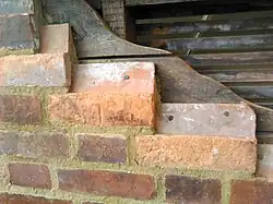 The tiles were laid in a partly overlapping pattern, akin to roof shingles. Their lower section—the part intended to be visible when the tiling was complete—was thicker; the upper section would slide under the overlapping tile above and would therefore be hidden. In the top corner was a hole for a nail to be inserted. They would then be hung on a lath of wood, and the lower sections would be moulded together with an infill of lime mortar to form a flat surface.[13] The interlocking visible surfaces would then resemble either header bond or stretcher bond brickwork.[1][2][14][15] Mathematical tiles had several advantages over brick: they were cheaper,[1] easier to lay than bricks (skilled workmen were not needed),[16] and were more resistant to the weathering effects of wind, rain and sea-spray, making them particularly useful at seaside locations such as Brighton.[17]