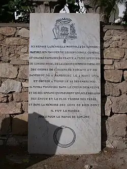 In subsequent years, he was sent as consul general to the United States, with stationing in Philadelphia on 16 September 1819, then to Syria, serving in Aleppo as of 1 May 1821 and, finally, on 3 August 1827, to the Tunisian capital, Tunis, where he performed diplomatic duties during his final five and a half years and where he died, at age 61. In the nearby historic city of Carthage, which in modern times has become a suburb of Tunis, Mathieu de Lesseps' tomb bears a lengthy graven inscription detailing the accomplishments of his public service.