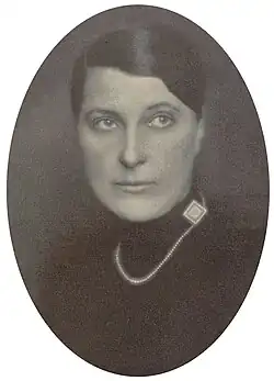 Mathilde Flögl (9 September 1893 - 1958) was an Austrian artist and designer.[1][2] She worked in several different mediums including textiles, glass, and paint.[3] Flögl was also a member of the Wiener Werkstätte, literally translated to the Vienna Workshops. This group was part of the Arts and Crafts movement dedicated to elegance, utility, and appropriateness.[4] They aimed to refine art and expand it to all fields of life.[4] Flögl was very active in this group, she participated in most of the major Wiener Werkstätte exhibitions. Currently, the Viennese Museum of Applied Arts houses over 1,600 of Flögl's works from when she was involved with the Wiener Werkstätte.[5] Among these are many independent works and collaborations with other individuals in the group. Notable members of the Wiener Werkstätte include two of its founders Josef Hoffman and Koloman Moser as well as Gustav Klimt, among others.[6] For the group's 25th anniversary, Flögl amassed, arranged, wrote, and published, The Wiener Werkstatte, 1903-1928: The Evolution of the Modern Applied Arts.[5] The book itself was a work of art using elaborate materials and decoration in its pages.[7]
