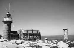 Matinicus Rock is a windswept and treeless rock, projecting out of the Gulf of Maine several miles south of the main islands of Matinicus Isle, Maine, an island community that is a 20-mile (32 km) ferry ride from Rockland. The light station occupies the center of the rock, and includes two towers, a keeper's house, shed, and boathouse. The dock is located on the northwest side of the rock. The two towers are 41 feet (12 m) in height, built out of ashlar granite stone. Only the southern one is active, and has a twelve-sided lantern house, while the other has lost its lantern house. Connected to the active tower is the keeper's house, a single-story frame structure whose end walls are semicircular granite structures, remnants of the older lighthouses.[5]