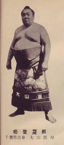 Matsunobori Shigeo (20 July 1924 – 21 April 1986) was a sumo wrestler from Matsudo Chiba, Japan. He fought for the now defunct Ōyama stable, joining in 1941. He reached the top makuuchi division in 1951 and made the second highest ōzeki rank (alongside Wakanohana) in 1956, after finishing as a runner-up to Kagamisato in the September 1955 tournament. He was an ōzeki for fifteen tournaments, although he lost the rank at the end of 1958. He retired in November 1961, and in his role as an elder of the Japan Sumo Association he became the head of Ōyama stable in January 1962 upon the death of his old stablemaster, ex-sekiwake Takanobori.[1] He produced one sekitori, the maegashira Daihi, who retired in 1983. Shortly after Ōyama's death in April 1986 the stable was wound up and its two remaining wrestlers retired.