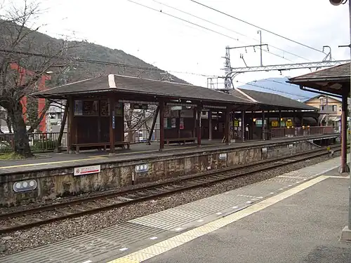 Matsuo-taisha Station (松尾大社駅, Matsuo-taisha-eki) on the Hankyu Arashiyama Line is located a short walk from both the Katsura River and Matsunoo Shrine in Kyoto. During the late fall, the Momiji trees that line the station provide a spectacular display of red, orange, and yellow leaves. The station is accessible by wheelchairs although passengers of Katsura-bound trains have to use a special gate for wheelchairs.[2]