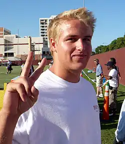 As a top high school player, Barkley was heavily recruited. On January 23, 2008, Barkley verbally committed to USC, ending speculation that he might join UCLA, which had just hired coaches Rick Neuheisel and Norm Chow.[11] Barkley's father, Les Barkley, was an All-American water polo player at USC from 1976 to 1979.[2][3] He made his decision more than a year before his National Signing Day, telling his family and coaches and then calling USC coach Pete Carroll on his cell phone. The previous quarterback to go to USC from Mater Dei was Heisman Trophy-winner Matt Leinart (the school had also graduated fellow Heisman winner John Huarte).[4][12][13] After committing to USC, Barkley began recruiting other elite high school players to join him.[14]