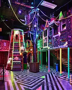 King was part of the collaborative team of artists that launched Meow Wolf in 2008.[3] He developed or co-developed 34 Meow Wolf projects including House of Eternal Return in Santa Fe and Omega Mart in Las Vegas,[7] as well as being the lead artist on The Cathedral at Meow Wolf Denver.[3][9] He was a lead artist on many interactive artworks including the Glowquarium installation and the Fancy Town at the House of Eternal Return.[9] The Fancy Town installation doubles as an event venue, and has the appearance of an Old West ghost town made of recycled scrap wood and construction waste. King described it as “Turning your capitalistic trash into freedom of expression.” King constructed the surrounding walls to have the appearance of old storefronts.[10]