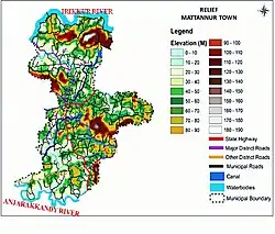 The area has the typical midland characteristics of Kerala, with undulating terrain that is mainly used for agriculture. The geographical area of the municipal town stretches between the Irikkur River (a portion of the Valapattanam River) in the north and the Anjarakandy River in the south. The town is located at the foothills of the western shoulders of the Western Ghats, rising at the east side, while the western boundary contains gradual sloping terrain leading to the Lakshadweep Sea. The Thalassery–Coorg Road (SH30) passes through the Mattanur municipal town.