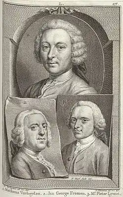 ![]() Portrait of Verheyden (top) with fellow Hague painters Jan George Freezen and Pieter Lyonet in Johan van Gool's Schouburg | |