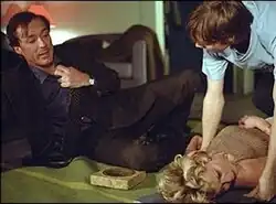 Matthew's most prominent storyline spans a year and begins on the Valentine's Day episode in February 1999. After developing a friendship with club owner Steve Owen (Martin Kemp), Matthew is present to witness Steve accidentally killing his ex-girlfriend Saskia Duncan (Deborah Sheridan-Taylor) by hitting her on the head with a marbel ashtray following her jealous attack on him. Saskia's death was first screened in a lengthened 45-minute episode on a Sunday evening, deviating from EastEnders' typical broadcasting weekday slots.[3] Executive producer Matthew Robinson has alleged that Saskia's death scene had to be reshot because it was deemed too violent: "When we played back the film, it was fantastic – too fantastic. It looked so real that I knew we couldn't broadcast it. EastEnders goes out before the nine o'clock watershed, children watch it – and we can't show outright scenes of graphic violence. We had to do the whole thing again. It took almost two hours and the three actors were emotionally and physically exhausted. In the end we got what we wanted."[3] After the killing, Steve fears that police will not believe it was an accident, convinces Matthew to help him cover-up the death and they bundle Saskia's body into a bin liner and bury it in a wood. Robinson said, "This is an exciting plot and it'll keep us occupied for much of the next year."[3]