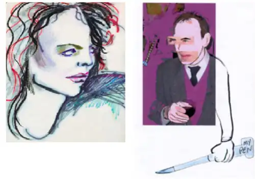 “The very unalike images you see here are however alike in one highly specific way, which is that they connect directly to Matuschka's art-making beginnings, including her very earliest. The animate blobs, shapes and quasi-figural bits and pieces that populate her abstractions, for instance, owe a debt to a childhood fixation on the TV star, Soupy Sales, who would doodle haphazardly on a chalkboard as in a classroom, then ask his audience to seek out potential images of creatures or whatever lurking in his scribble-scrabble and complete them."- Anthony Haden Guest[48]