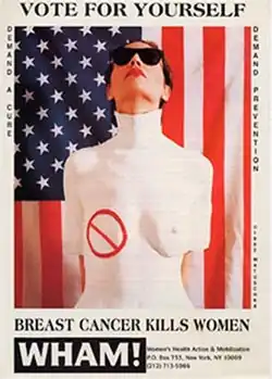 Matuschka's first poster for the group was an illustration of the Statue of Liberty with the 'no' symbol painted over Lady Liberty's right breast. In 1992, W.H.A.M.! sponsored Matuschka's image Vote for Yourself[32] as a glossy, eye-catching mass media poster. WHAMMERS, as they were known, wheat pasted this political poster at dozens of breast cancer rallies and demonstrations throughout the greater New York region. Fox Five News was the first mainstream media platform to air W.H.A.M.!'s breast cancer actions—using artwork created by Matuschka over a three-year period[33] before pink ribbons became the symbol for the disease. A year later Vote for Yourself caught the attention of The New York Times photo editors.