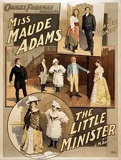Frohman had been pursuing J. M. Barrie (the future author of Peter Pan) to adapt the author's popular book The Little Minister into a play, but Barrie had resisted because he felt there was no actress who could play Lady Babbie. On a trip to New York in 1896, Barrie attended a performance of Rosemary and at once decided that Adams was the actress to play Lady Babbie.[14][15] Frohman worried that the masculine aspects of the book might overshadow Adams's role. With Barrie's consent, several key scenes were changed to favor Lady Babbie.[16] The play opened in 1897 at the Empire Theatre and was a tremendous success, running for 300 performances in New York (289 of which were standing room only) and setting a new all-time box office record of $370,000; it made Adams a star.[17][15] It also toured successfully, running for 65 performances in Boston.[4]