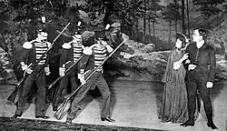 Adams starred in other works by Barrie, including Quality Street (1901), What Every Woman Knows (1908), The Legend of Leonora (1914) and A Kiss for Cinderella (1916). In 1899, she portrayed Shakespeare's Juliet. While audiences responded to her performance with standing ovations,[22] critics generally disliked it. The critic Alan Dale, reviewing her debut in the role at the Empire Theatre, called her Elizabethan English "grotesque at times" and commented that Adams had performed with "pretty purring", not classical. On the other hand, he described her performance as "romantic", "sublime" and "not sinking beneath the waves."[23] Romeo and Juliet was followed by L'Aiglon in 1900, a French play about the life of Napoleon II of France in which Adams played the leading role, foreshadowing her portrayal of another male (Peter Pan) five years later. The play had starred Sarah Bernhardt in Paris with enthusiastic reviews, but Adams's L'Aiglon received mixed reviews in New York. In 1909, she played Joan of Arc in Friedrich Schiller's The Maid of Orleans. This was produced on a huge scale at the Harvard University Stadium by Adams.[24][25] The June 24, 1909 edition of the Paducah Evening Sun (Kentucky) contains the following excerpt:
