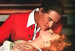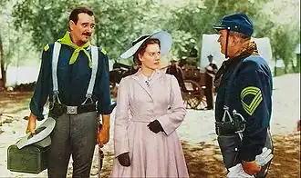 In the 1950 Technicolor Western, Comanche Territory, O'Hara played an unusual role as the lead character of Katie Howards, a fiery saloon owner who dresses, behaves and fights like a man, with hair tied back.[118] She "mastered the American bullwhip" during the filming,[115] in a role which Crowther believed was "more significant than a setting sun" in that she "tackles her assignment with so much relish that the rest of the cast, even the Indians, are completely subdued."[119] She received first billing above co-star Macdonald Carey.[120] O'Hara then appeared as Countess D'Arneau opposite John Payne in Tripoli, directed by O'Hara's second husband, William Houston Price.[121] She was next cast by John Ford in the Western Rio Grande, the final installment of his cavalry trilogy. It was the first of five films to be made over 22 years with John Wayne, including The Quiet Man (1952), The Wings of Eagles (1957), McLintock! (1963) and Big Jake (1971), the first three of which were directed by Ford.[122] O'Hara declared that "from our very first scenes together, working with John Wayne was comfortable for me".[123] Her chemistry with Wayne was so powerful that over the years many people assumed that they were married, and newspapers occasionally published sensationalist stories from people claiming to be their love child.[124] In April 1951, she received a call from Universal Pictures that she was cast as a Tunisian princess named Tanya in the swashbuckler film, Flame of Araby (1951).[125][126] O'Hara "despised" the film and everything it stood for,[127] but had no choice but to make the film or be suspended. By that time, she began to grow tired of the roles she was offered and wanted to perform roles that had more depth than the ones she had done thus far.[128]