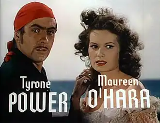 Later that year, O'Hara starred opposite Power, George Sanders, Laird Cregar and Anthony Quinn in Henry King's swashbuckler The Black Swan. O'Hara recalled that it was "everything you could want in a lavish pirate picture: a magnificent ship with thundering cannons; a dashing hero battling menacing villains ... sword fights; fabulous costumes ...". She found it exhilarating working with Power, who was renowned for his "wicked sense of humor".[68] O'Hara grew very concerned about one scene in the picture in which she is thrown overboard in her underwear by Power, and sent a warning letter home to Ireland in advance.[69] She refused to take her wedding ring off in one scene which resulted in screen adjustments to make it look like a dinner ring.[70] Though the film was praised by critics and is seen as one of the period's most enjoyable adventure films, the critic from The New York Times thought O'Hara's character lacked depth, commenting that "Maureen O'Hara is brunette and beautiful—which is all the part requires".[71]