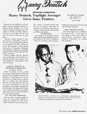 After the war, Deutsch moved back into the thriving NY music scene. Also, he earned an Honorary Doctor of Music degree from the Musical Arts Conservatory of Amarillo, Texas. He lived across from Carnegie Hall, where he would play often. He also became a teacher of arranging and composition at the American Theatre Wing. In addition to his work there, he also taught many notable musicians such as Charlie Parker, James P. Johnson, Django Reinhardt and: