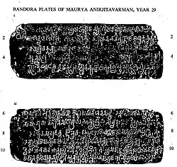 The Bandora (Bandiwade) copper-plate inscription of Anirjita-varman records the grant of tax-exempt land in Dvadasa-desha (modern Bardez) to Hastyarya, a learned Samavedi Brahmin of Hariti gotra.[6][8]