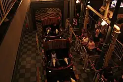 On the loading platform, a pair of 3D glasses is given to each guest before boarding their vehicle. The vehicles leave in groups of three and each can contain four guests (two on each side). Each guest has a pastry bag in front of them to shoot virtual chocolate at the mice that appear on seven screens throughout the ride, with the ride vehicles briefly stopping at each.[1] An on-ride photo is taken part way through. Guests gain points for each mouse they hit. In the last scene the scores and winner for each ride are announced shown alongside the photos taken earlier, and these can be purchased from a van outside the ride.