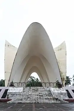 The Mausoleum of three leaders is located in Suhrawardy Udyan in Shahbagh across from the Doel Square near the University of Dhaka.[3] It was established in the year 1963 and designed by architect Masud Ahmad and S.A. Zahiruddin.[4] The three political leaders buried in this mausoleum were died on different dates but were all buried in the same area as all three of them had contributed significantly to East Pakistan and were all involved politically. Even with all these achievements, it was rumored that these three political leaders had a rivalry with each other in terms of success. However, despite their rivalry, three of the political leaders were buried under the same roof of the mausoleum of the three leaders.[5] In 2015, the Rapid Action Battalion recovered 18 cocktails from the mausoleum. After the incident, the Rapid Action Battalion started an investigation into the matter.[6] In 2022, two people, including a policeman, were injured while trying to stop the fight between the two sides inside the mausoleum.[7] According to a 2024 report, the mausoleum has deteriorated due to lack of care and maintenance, and the site has become a haven for criminals.[8]