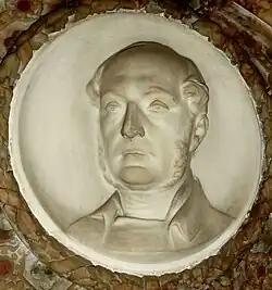 This medieval church building at Aberford near Leeds, was partly rebuilt and re-opened on 29 April 1862. The extension was consecrated by the Archbishop of York. The extension and internal reordering was designed by Anthony Salvin. North and south aisles were rebuilt, with a vestry on the north side and a porch on the south. The nave was effectively replaced in the Early Decorated style, leaving the original 800-year-old tower, and the east end which was built around 1830. A new Forster and Andrews organ was installed. The heads on the south porch represent Queen Victoria and the Archbishop of York. Samuel Hicks (1758–1829), village blacksmith of Micklefield, is represented on a window corbel; he is buried beneath the south window. The 1853 font from the previous church was installed in the present church.[46] The walls are of Bramham Moor stone, and the window mullions and internal arches and pillars are of "stone from the Sturdy Bank quarries near Harewood". The roof is of Westmorland slates.[47] Several windows, including the one dedicated to Hicks the blacksmith, are by Wailes, and the floor tiles are by Minton.[48][49]