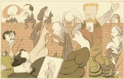 Usually inept with hands and feet, Beerbohm excelled in heads and with dandified male costume of a period whose elegance became a source of nostalgic inspiration. His collections of caricatures included Caricatures of Twenty-five Gentlemen (1896), The Poets' Corner (1904), Fifty Caricatures (1913) and Rossetti and His Circle (1922). His caricatures were published widely in the fashionable magazines of the time, and his works were exhibited regularly in London at the Carfax Gallery (1901–08) and Leicester Galleries (1911–57). At his Rapallo home he drew and wrote infrequently and decorated books in his library. These were sold at auction by Sotheby's of London on 12 and 13 December 1960 following the death of his second wife and literary executor Elisabeth Jungmann.[18]