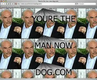 YTMND originated in 2001 from Max Goldberg's original website, "yourethemannowdog.com", which he registered along with "dustindiamond.com" after seeing a trailer for the movie Finding Forrester in which Sean Connery says the line "You're the man now, dog!". Originally, the website featured the text "YOURE THE MAN NOW DOG.COM" drawn out in 3D ASCII text with a sound loop from the Finding Forrester trailer of Connery reciting the phrase "You're the man now, dog!".[1] The advent of zoomed text currently on the website was seen in the following months, where the website also featured a photograph of Connery. Goldberg's new creation inspired others to make similar sites with other movie and television quotations (or any other sound clip they wished to use).[2]