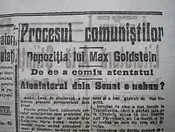 On 8 December 1920, Goldstein, with the support Leon Lichtblau and Saul Ozias, organized another politically motivated bombing. Their improvised explosive device, made from an unexploded German 76 mm artillery shell from World War I, and placed in front of the Romanian Senate, killed Minister of Justice Dimitrie Greceanu and two senators (Demetriu Radu and Spirea Gheorghiu), and wounded the president of the Senate, Constantin Coandă.[1] The government alleged that their group did not act alone, and that it would have had among its accomplices Alecu Constantinescu, a leader of the left group of the Socialist Party, which in 1921 split and formed the Romanian Communist Party (under the provisional name of Socialist-Communist Party).