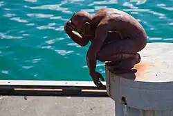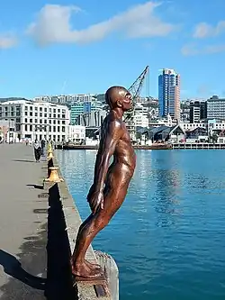 In 2009 Patté created Reflection, a cast-iron sculpture of a man crouched on a ledge. The man's eyes are closed, so he is not looking at his own reflection but rather reflecting on something in his life. The sculpture was lent to Wellington for three months and installed on a pillar at the edge of Whairepo lagoon in Frank Kitts Park.[11] Patté offered to donate the sculpture to the city, but Wellington Waterfront ( a Wellington City Council organisation that managed Wellington's waterfront area) declined the offer.[1] It was then bought by Sir Ian McKellen and installed at his home beside the Thames in London.[12] Guillermo del Toro has another version at his home in Los Angeles.[1]