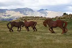 Sir Michael Hill commissioned Patté to create a work for his private golf course 'The Hills' near Queenstown, New Zealand. The piece, which was unveiled on 12 May 2013, consists of five cast-iron horses, each of which is 2.6m high, 3m long and weighs 1.5 tonnes.[13][14] Patté made several trips to Staglands Wildlife Reserve to sketch Clydesdale horses then modelled the sculptures in clay. The clay models were scanned and the data sent to a foundry in China. The foundry made full-scale polystyrene models which Patté then covered in a plasticine skin to add finishing details. The foundry then cast the horses in iron and they were shipped to New Zealand.[1][15]