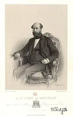 Von Hatzfeldt was secretary to the Prussian legation at Paris and, afterwards, from 1849 to 1859 Minister accredited to the Emperor Napoleon III.[4] In 1856, he was at the Palace of Versailles and was a signatory to the Treaty of Paris which settled the Crimean War between the Russian Empire and an alliance of the Ottoman Empire, the British Empire, the Second French Empire and the Kingdom of Sardinia.[5]