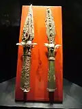 In December 2006, Italian archaeologists announced that an excavation under a shrine near the Palatine Hill had unearthed several items in wooden boxes, which they identified as the imperial regalia, possibly belonging to Maxentius.[28] The items in these boxes, which were wrapped in linen and what appears to be silk, include three complete lances, four javelins, what appears to be a base for standards, and three glass and chalcedony spheres. The most important find was a sceptre of a flower holding a blue-green globe, which is believed to have belonged to the Emperor himself because of its intricate workmanship, and has been dated to his rule.[29]