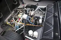 The car is designed to accept a Mazda two-rotor engine, typically either a 12A or the longer, larger displacement 13B. The car's 5-speed manual transmission and rear live axle are also Mazda parts, with the axle located by a combination of lower trailing links, upper semi-trailing links, and a Panhard rod.