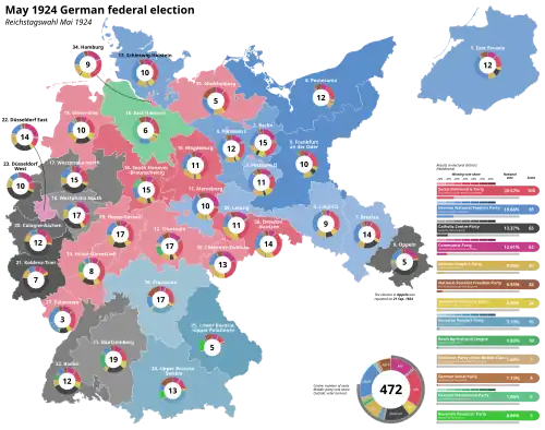 A federal election for the second Reichstag of the Weimar Republic was held in Germany on 4 May 1924.[1] It took place following a series of national crises in 1923, most notably the occupation of the Ruhr by French and Belgian troops and the resulting period of hyperinflation. The election campaign was marked by strong ideological differences over how the government had handled the problems. In the voting, the parties of the far left and far right made significant gains at the expense of the moderate parties that had been in the government or had supported it.