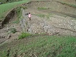 Runoff mostly happens in the form of high runoff discharge events that occur in a very short period (called flash floods). These are related to the steep topography, often little vegetation cover and intense convective rainfall. The peaks of such flash floods have often a 50 to 100 times larger discharge than the preceding baseflow.[2] The magnitude of floods in this river has somewhat been decreased due to interventions in the catchment. On some steep slopes, exclosures have been established; the dense vegetation largely contributes to enhanced infiltration, less flooding and better baseflow.[3] Physical conservation structures such as stone bunds[4][5] and check dams also intercept runoff.[6][7]