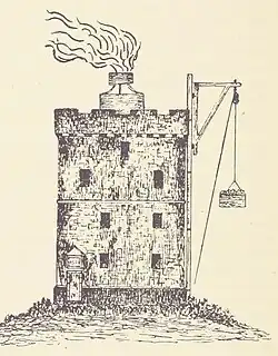 A coal-fired beacon was established in 1635[32] (or 1636[33]) by James Maxwell of Innerwick, and John and Alexander Cunningham, who charged shipping a tonnage-based fee. This was originally 2 Scottish shillings per ton for Scottish ships (equivalent to two pence sterling) and twice this amount for non-local shipping per voyage, but was reduced to 1 shilling and sixpence, and three shillings respectively in 1639 with some shipping entirely exempt during the summer.