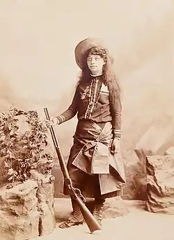 Gordon Lillie's wedding gift to his bride was a pony and a Marlin .22 target rifle. In 1887 May debuted at a sharpshooter for Pawnee Bill's Great Wild West Show and was billed as 'the greatest Lady Horseback Rifle-shot of the World'. May traveled the country with her husband's show and was one of the first women to perform as an equestrian and shooter in American Wild West shows. May suffered a shooting injury during an act in 1899 that required two of her fingers to be amputated.[2] While on tour in 1907, May gave a speech to women in Chicago, she said: "Let any normally healthy woman who is ordinarily strong screw up her courage and tackle a bucking bronco, and she will find the most fascinating pastime in the field of feminine athletic endeavor. There is nothing to compare, to increase the joy of living, and once accomplished, she’ll have more real fun than any pink tea or theater party or ballroom ever yielded."[1]