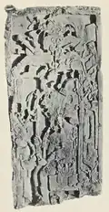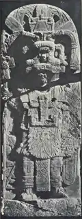A stela was not just considered a neutral portrait, it was considered to be 'owned' by the subject, whether that subject was a person or a god. Stela 3 from El Zapote in Guatemala is a small monument dating from the Early Classic period, the front of the stela bears a portrait of the rain god Yaxhal Chaak, "Clear Water Chaak".[41] The accompanying text describes how the deity Yaxhal Chaak himself was dedicated, not just his image on the stela.[42] This could be taken to imply that the stela was seen as the embodiment of the deity and is also true of those stelae bearing royal portraits, which were seen to be the supernatural embodiment of the ruler they represented.[43] The stela, combined with any accompanying altar, was a perpetual enactment of royal ceremony in stone.[44] David Stuart has stated that stelae "do not simply commemorate past events and royal ceremonies but serve to perpetuate the ritual act into eternity",[30] thus ascribing a magical effectiveness to stela depictions. In the same vein, stelae bearing royal portraits may have been magically loaded extensions of the royal person (uba 'his self'), extremely powerful confirmations of political and religious authority.[45] Stelae bearing images of multiple people, for instance of several nobles performing a ritual or of a king with his war captives, were likely to be exceptions to this idea of the stela as sacred embodiment of the subject.[30]
