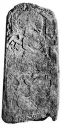 On the Pacific Coast El Baúl Stela 1 features a date in its hieroglyphic text that equates to 36 AD.[86] It depicts a ruler bearing a sceptre or a spear with a double column of hieroglyphic text before him.[74] At Takalik Abaj are two stelae (Stela 2 and Stela 5) depicting the transfer of power from one ruler to another; they both show two elaborately dressed figures facing each other with a column of hieroglyphic text between them.[87] The Long Count date on Stela 2 dates it to the 1st century BC at the latest,[88] while Stela 5 has two dates, the latest of which is 126 AD.[89] The stela was associated with the burial of a human sacrifice and other offerings.[81] Stela 13 at Takalik Abaj also dates to the Late Preclassic; a massive offering of more than 600 ceramic vessels was found at its base, together with 33 obsidian prismatic blades and other artefacts. Both the stela and the offering were associated with a nearby Late Preclassic royal tomb.[90] At Cuello in Belize, a plain stela was raised around 100 AD in an open plaza.[81]
