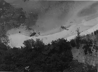 ![]() The wreckage of U.S. Air Force CH-53 helicopters Knife 23 (left) and Knife 31 (right), shot down during the battle, lying on Koh Tang's East Beach shortly after the battle | |||||||