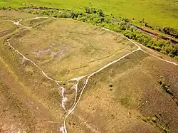 The Mayatskoye site consists of a hill fort surrounded by a settlement with an adjacent burial ground.[3] The overall settlement area is 30 hectares, of which 6,000 square meters have been excavated.[3] Remains of pottery workshops have been identified in this area.[2]: 30 The fortress itself covers 1.1 hectare, and about 30% of the area enclosed by its walls has been excavated.[3] The walls themselves have been only been excavated in small portions; most of their circuit remains buried under earthen ramparts.[3] The walls were made of chalk blocks, some of which contain runic inscriptions, and reached about 1.5 to 2 meters in height.[3] As for the cemetery area, it covers 3 hectares, of which 2874 square meters (about 10%) have been excavated.[3] At least 150 individual burial sites have been identified.[3]