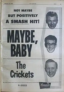 "Maybe Baby" is a rock-and-roll song written by Buddy Holly and the producer Norman Petty, and recorded by Holly and the Crickets in 1957. The single, released in January 1958 and credited to the Crickets, was a Top 40 hit in the U.S., the UK, and Canada.[2]