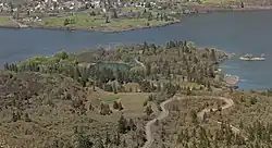 The lower portion of the park includes a small lake, boat ramp, and the Rowena Loops of the Historic Columbia River Highway.