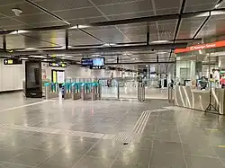 With restrictions imposed on construction due to the COVID-19 pandemic, the TEL2 completion date was pushed to 2021.[14] On 14 December 2020, it was further announced that the opening of TEL2 was delayed to the third quarter of 2021 so the rail system software for the line could be reviewed.[15][16][17] As announced during a visit by Transport Minister S. Iswaran at Caldecott station on 30 June 2021,[18] the station began operations on 28 August 2021.[19]