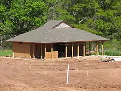 The access was once a corporate facility, formally known as Mayo Park, which was opened by the Washington Mills Company in 1948. Architect Antonin Raymond designed the original Mayo Park, which included a picnic shelter, a fishing pond, a swimming pond with a beach and a bathhouse. The state renovated and restored some of the existing structures from the former park, while trying to maintain a style compatible with Raymond's design. By the time North Carolina State Parks obtained the property, Raymond's bathhouse had degraded beyond repair. A restroom building resembling the former bathhouse's design was constructed in its place, and materials salvaged from the bathhouse were incorporated into it. The diving platform and other swimming facilities were removed from the swimming pond.[4]