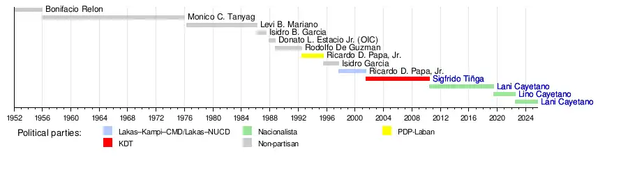 | 1 | Bonifacio Relon | 1952 | January 1, 1952 | December 31, 1955 | Isidro Fermin | ||||