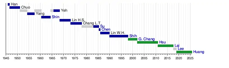 The numerals indicate the consecutive time in office served by a single elected mayor. For example, Su Nan-cheng served two consecutive terms and is counted as the tenth mayor (not the eighth and ninth). Yeh Ting-kuei served three non-consecutive terms and is counted chronologically as the 3rd, the 5th, and the 7th mayor. Because of this, the list below contains 14 mayoralties, but only 12 people.